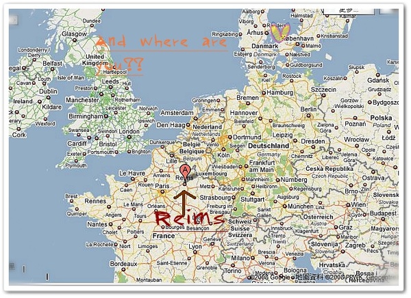 咖啡色箭頭((小畫家畫的還真醜))指的A點,就是我在的位置Reims,法文發音翻譯漢斯,英文發音的話翻蘭斯。