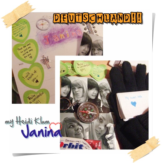要走之前,他送我一雙舊的手套,折成很可愛的形狀,裡面有一條德製的口含涼糖、一封信和照片、一個天使墜飾、一個小指南針和四張愛心貼。他說指南針讓我無論在哪裡都找的到她,手套讓我下雪也不冷;我也寫了一些東西不過沒有拍出來。